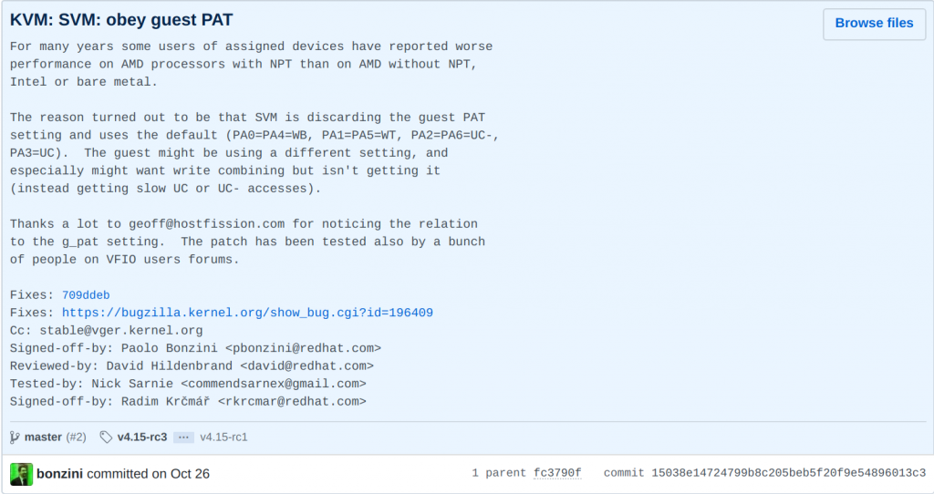 Luckily for AMD users, Linus Torvalds has merged the NPT patch into the master branch of the Linux Kernel. As as a result, He has released Linux Kernel 4.15-rc1 with the patch included. In the GitHub tag for 4.15-rc1, you can see the patch has been applied. 4.14.3 and later kernels have this patch back ported as well. Paolo Bonzini, who created the patch, is the same person who submitted the commit on GitHub.