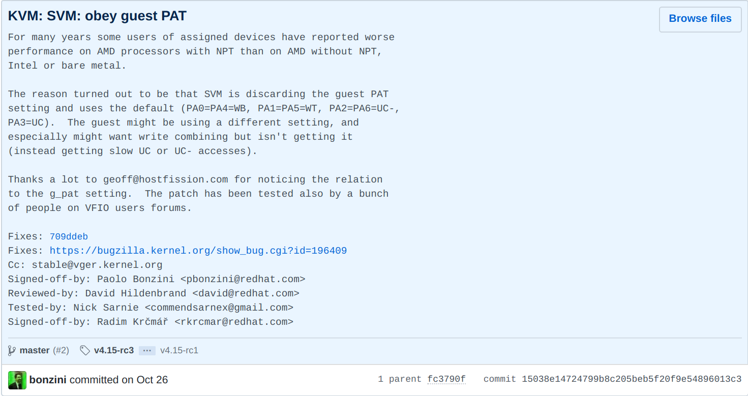 Luckily for AMD users, Linus Torvalds has merged the NPT patch into the master branch of the Linux Kernel. As as a result, He has released Linux Kernel 4.15-rc1 with the patch included. In the GitHub tag for 4.15-rc1, you can see the patch has been applied. 4.14.3 and later kernels have this patch back ported as well. Paolo Bonzini, who created the patch, is the same person who submitted the commit on GitHub.