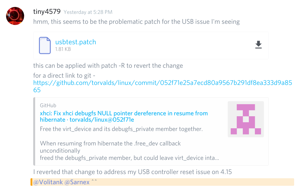 While in contact with the kernel developers to solve this problem, VFIO Redditor Tiny4579 discovered the commit that was causing his issue. The conflicting patch is designed to free the virt_device and its debugfs_private member together, instead of separately. This patch causes a kernel oops while trying to reassign a USB controller or USB HBA to the virtual machine. After community testing, reversing the patch was confirmed to solve the issue for multiple people.